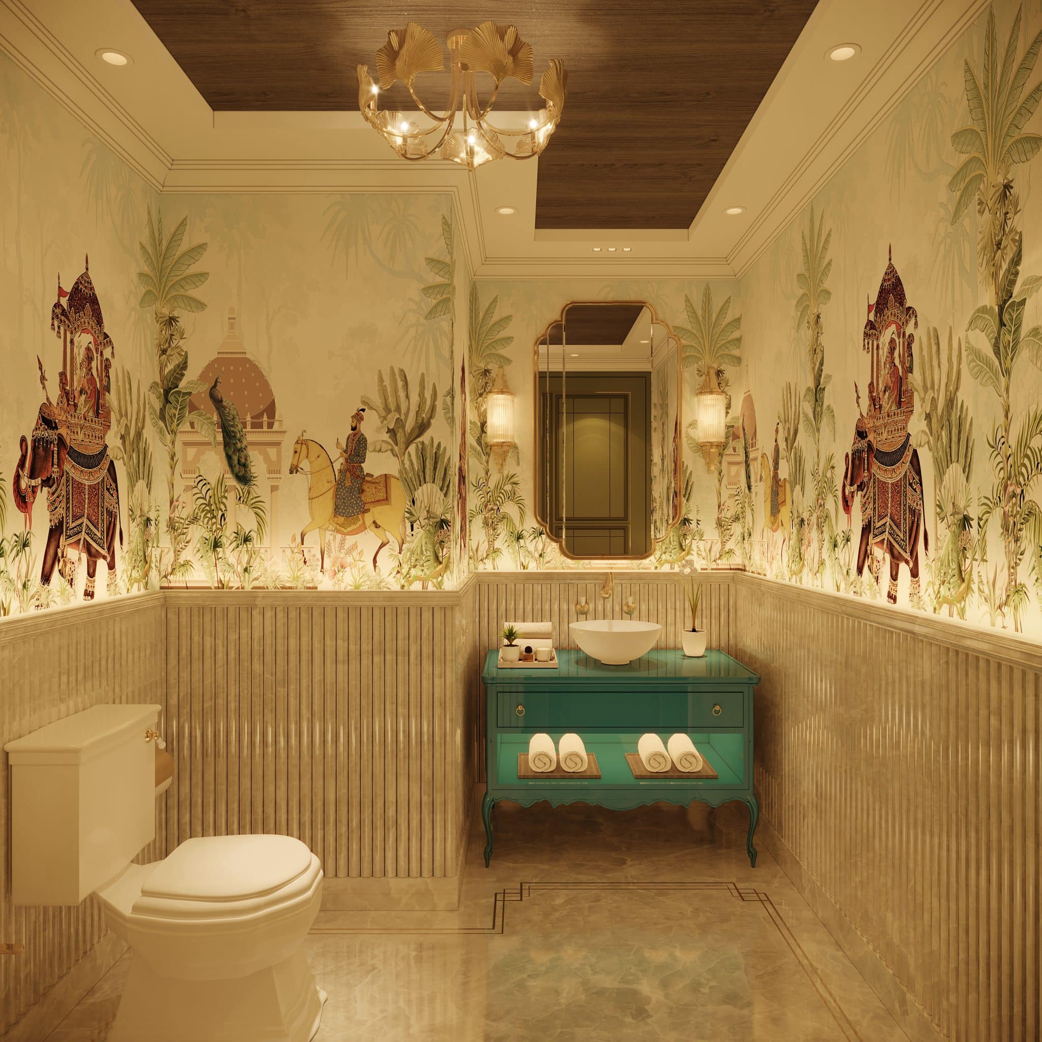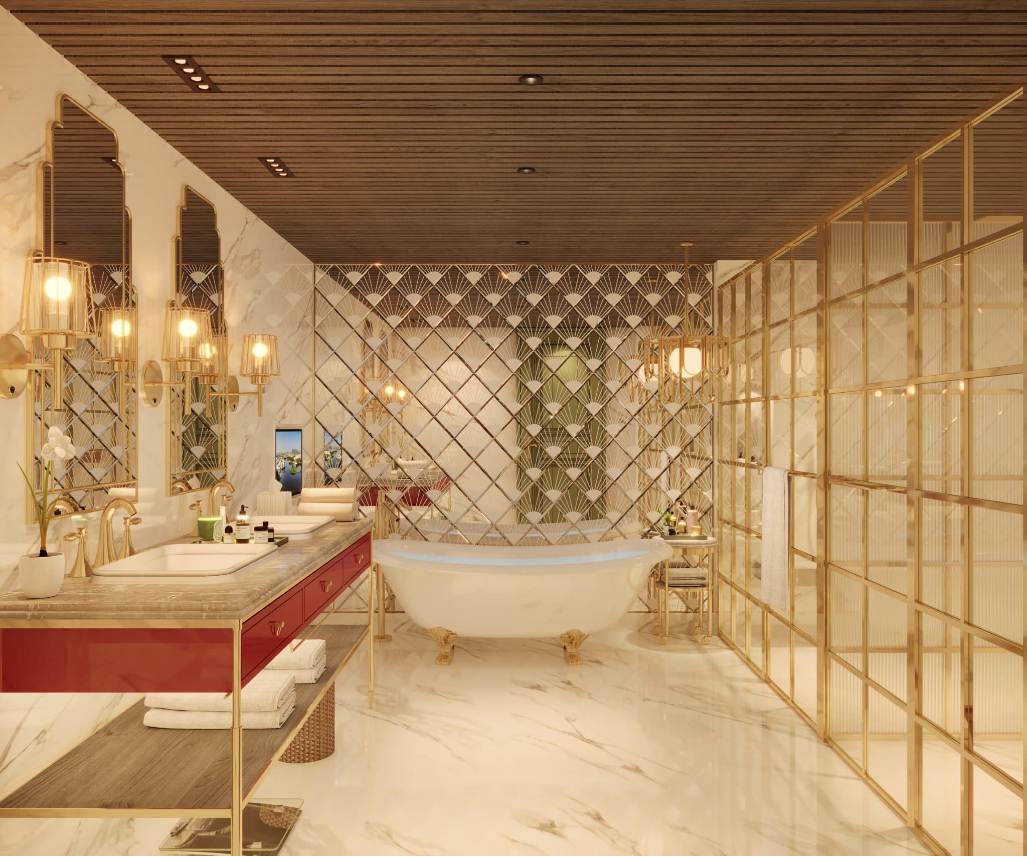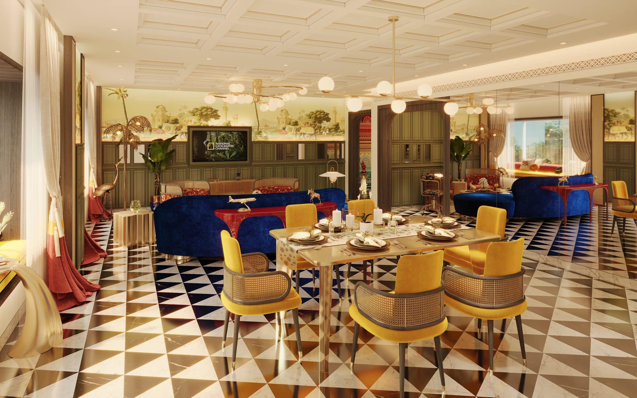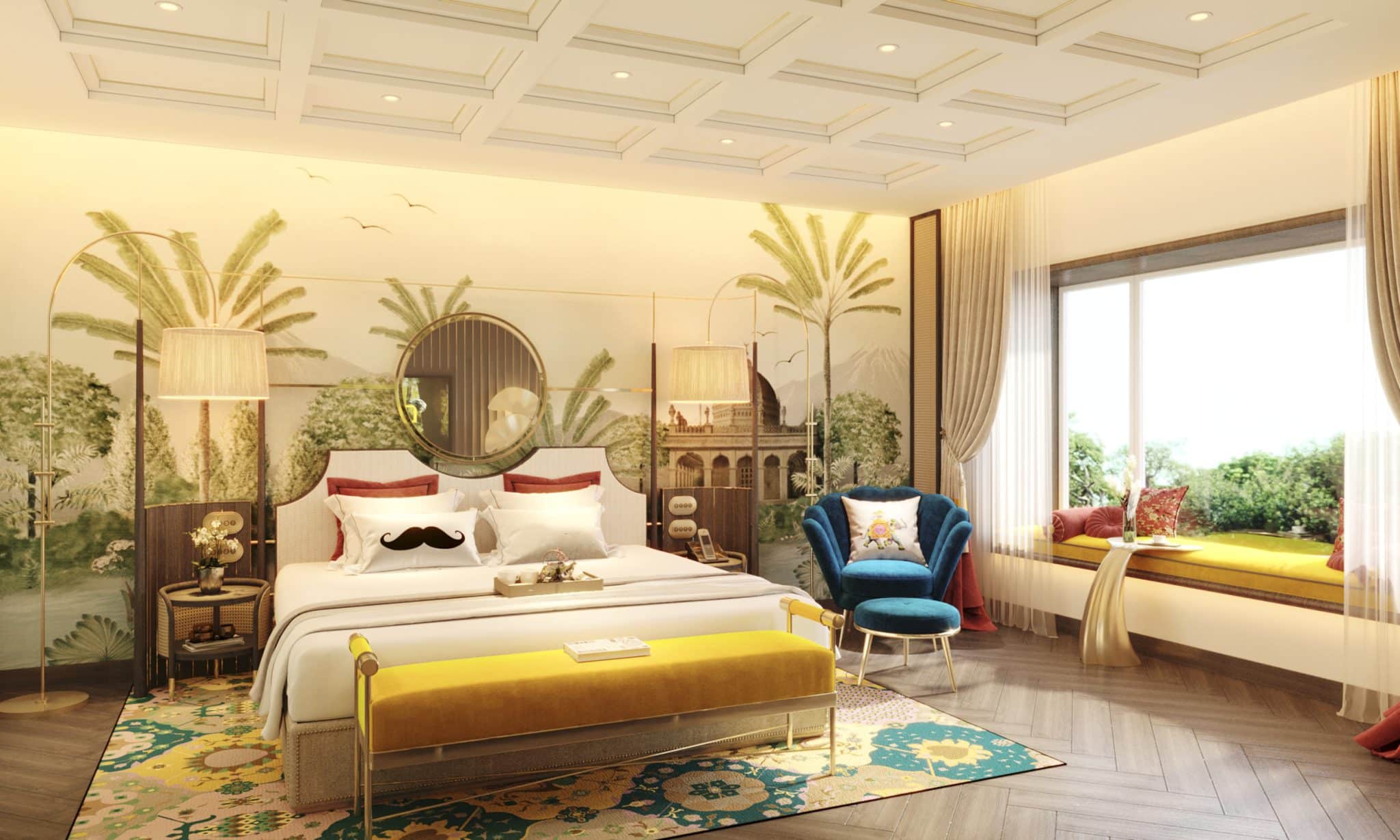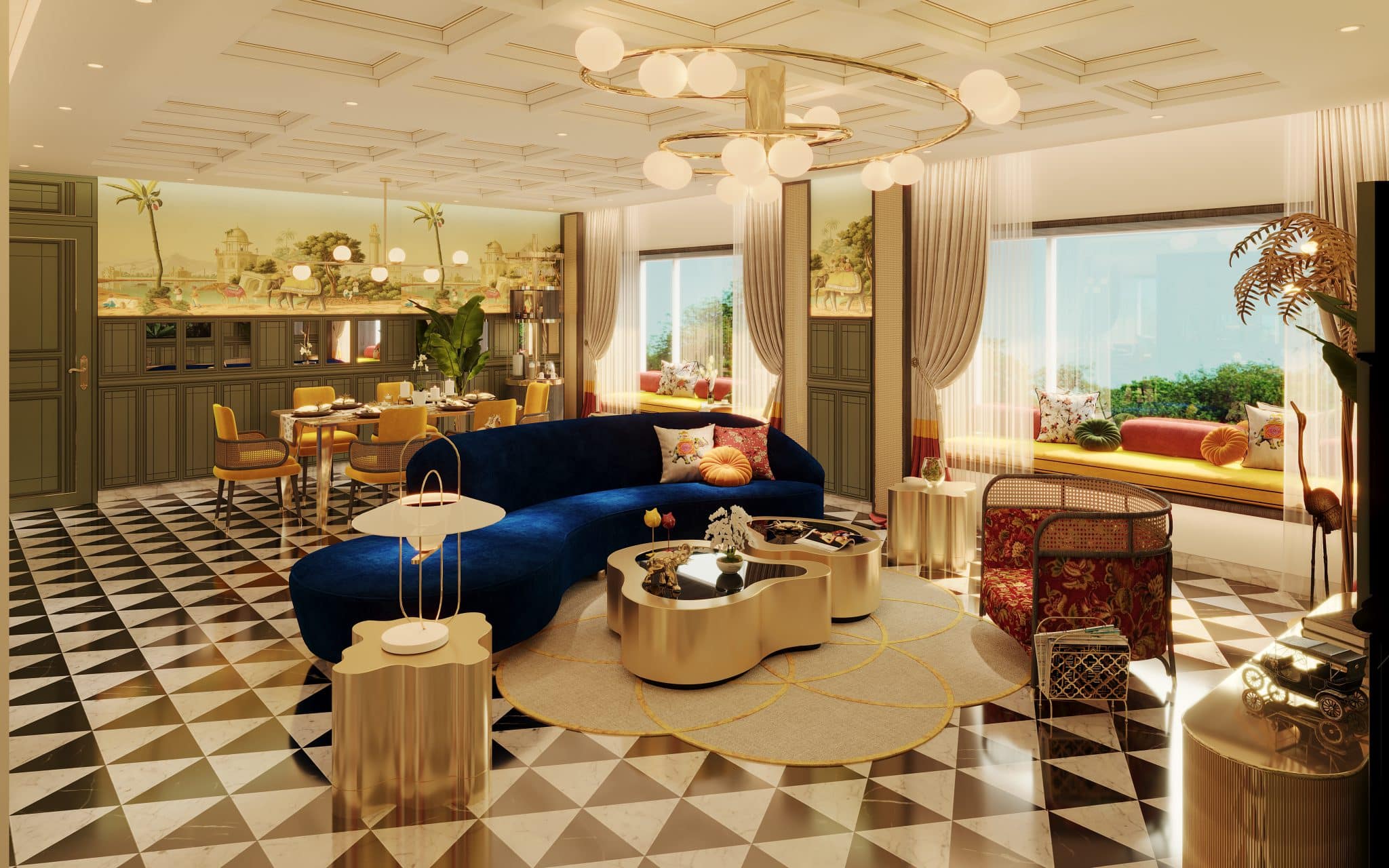 The suite, encompassing a master bedroom, dining room, an enclosed balcony lounge, and a study, mirrors the vibrant, witty and warm personality of the hodophile and his unique sartorial choice through colours and patterns, as well as showcases a combination of contemporary and mid-century aesthetics. Luscious red elements, graphic handlebar moustaches gracing the cushions, airplane-style windows, vintage luggage, richly detailed furniture and curated artwork dovetail in a spatial experience brimming with regal whimsy.