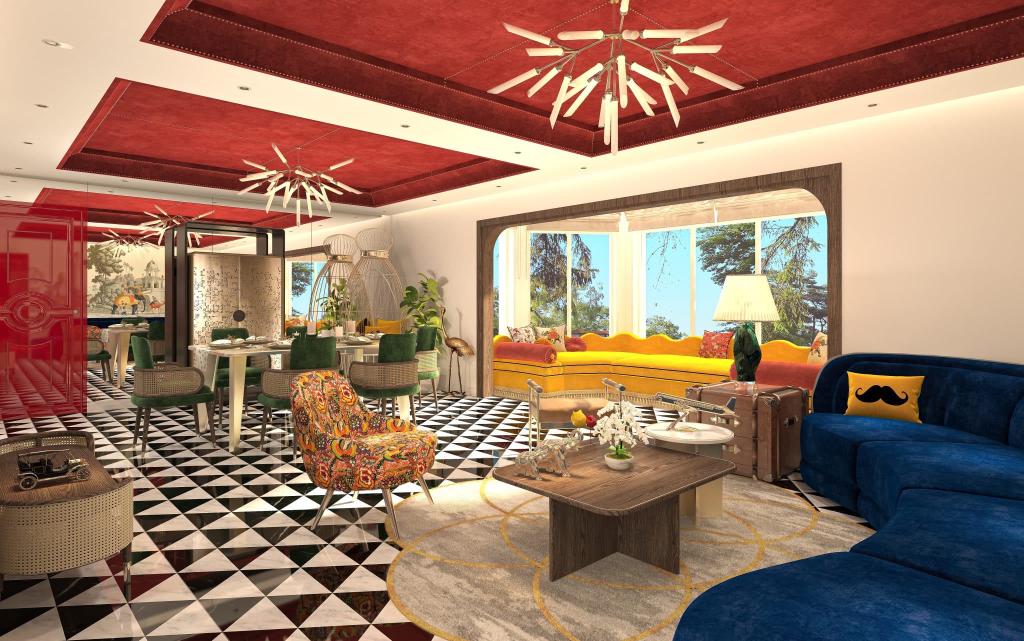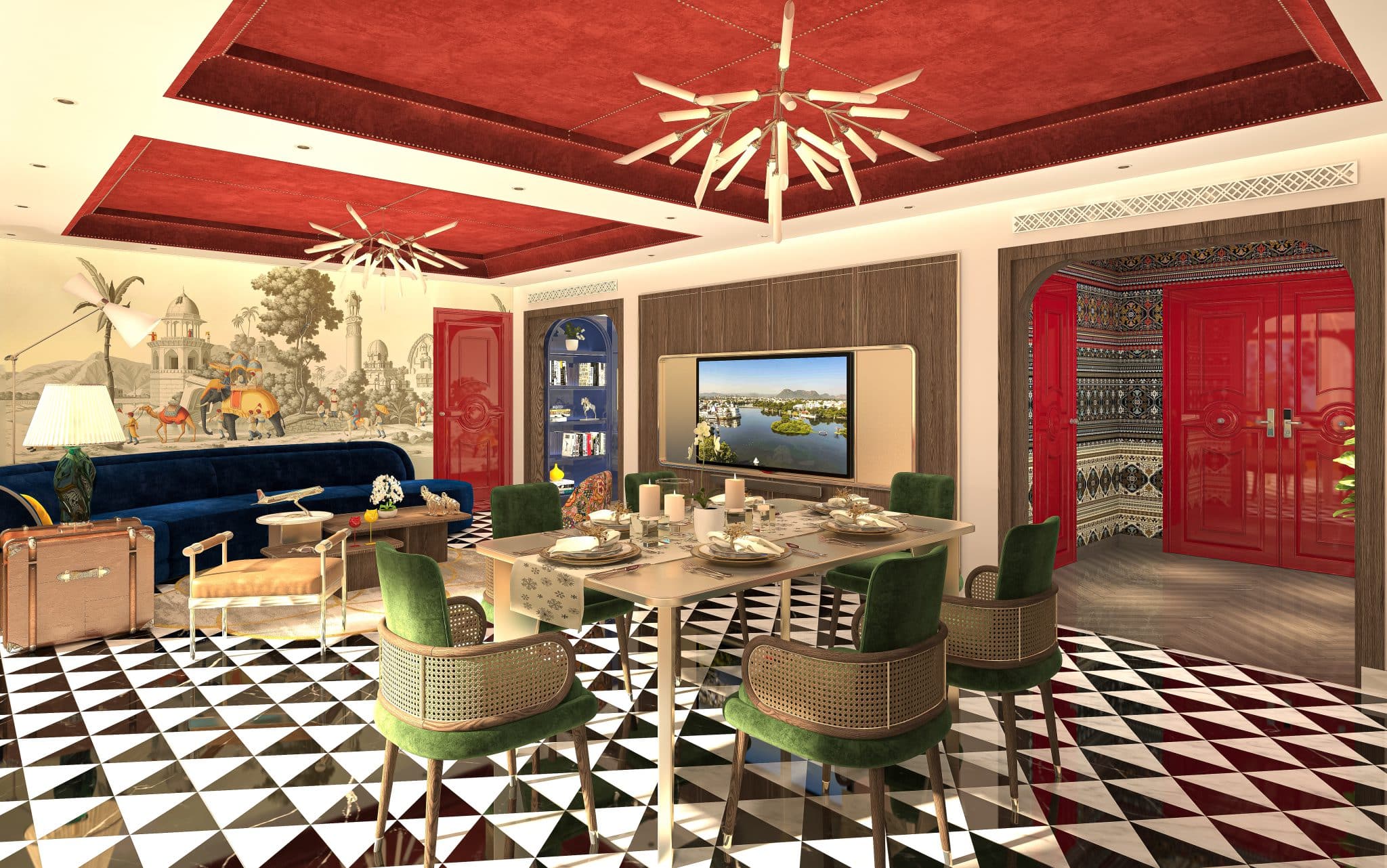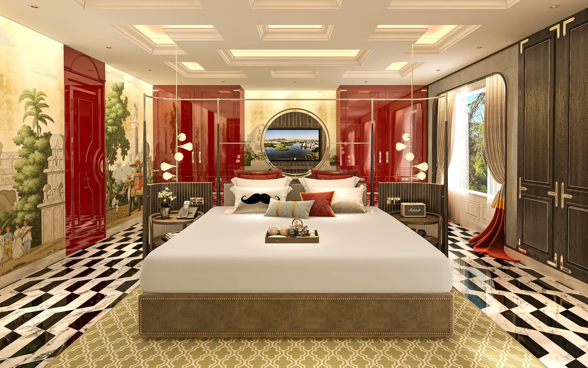 The suite, encompassing a master bedroom, dining room, an enclosed balcony lounge, and a study, mirrors the mascot's vibrant, witty, and warm personality through specific colors and patterns, and showcases a combination of contemporary and mid-century aesthetics. Design elements such as luscious red accents, cushions graced with graphic handlebar moustaches, framed airplane-style windows, vintage luggage, richly detailed furniture, and curated artwork dovetail in a spatial experience brimming with regal whimsy. This initiative, centered on brand leveraging strategy, successfully translates the Air India Maharaja mascot's unique sartorial choices and spirit into a luxurious, high-end hospitality environment.