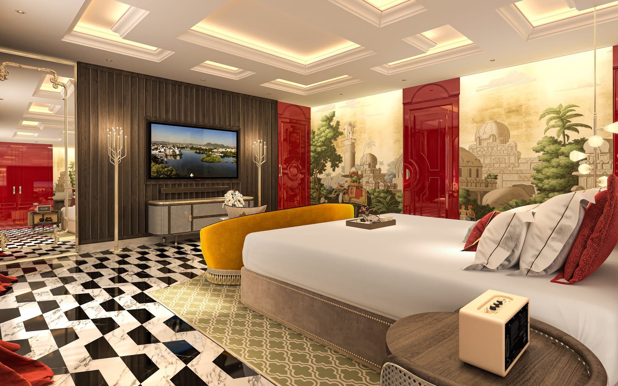 Following the acquisition of Air India, the Tata Group initiated major strategic shifts in leveraging the airline’s assets, including the resurrection of the Maharaja, the airline's iconic mascot. Reviving his widely popular persona was a strategic move, enabled through the creation of sumptuous, boudoir-like suites in Taj Hotels, the luxury chain within the Tata Group. Bobby Mukherrji Architects developed the suite design , rolling out this seamless travel and accommodation experience first with the Taj Mahal New Delhi and Taj Lands End Mumbai.