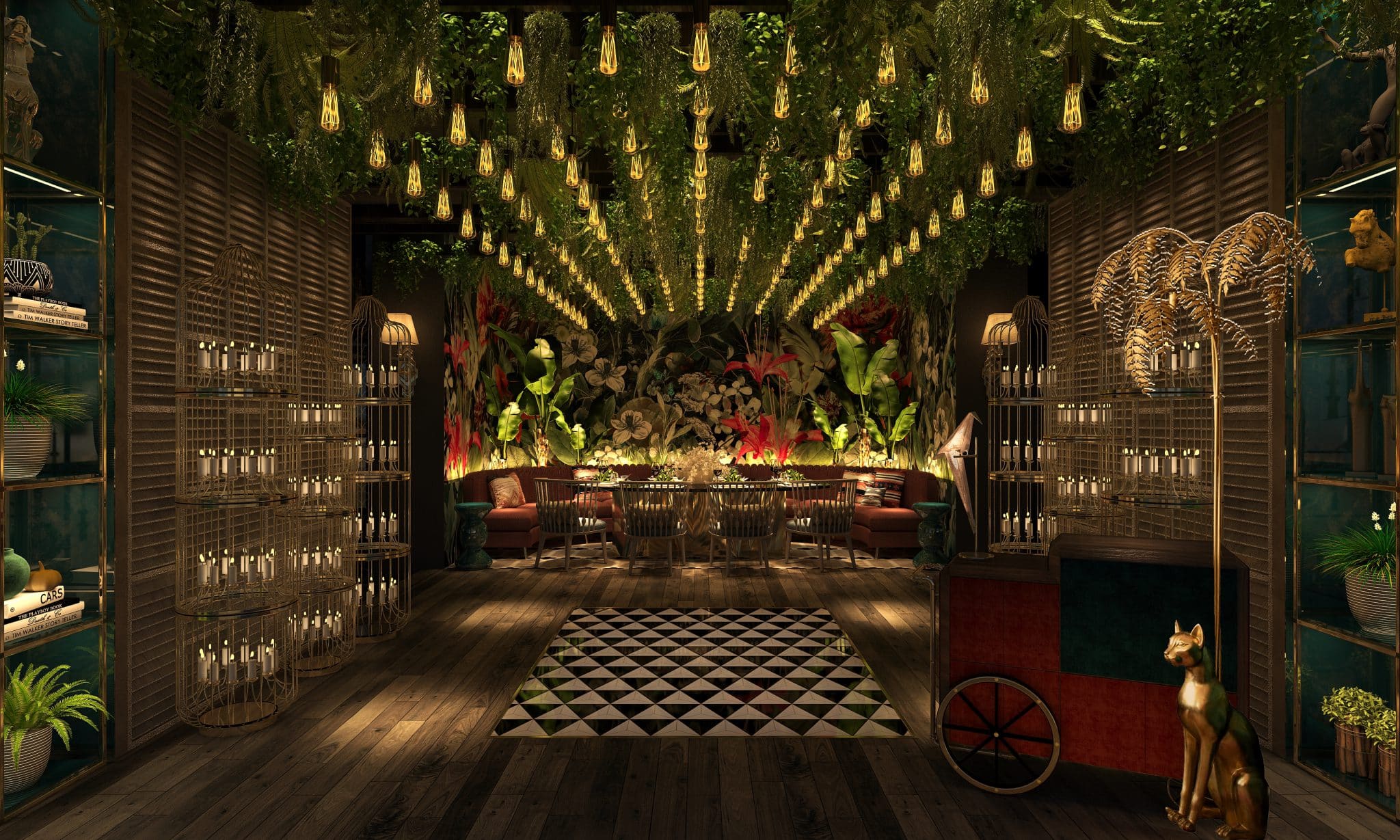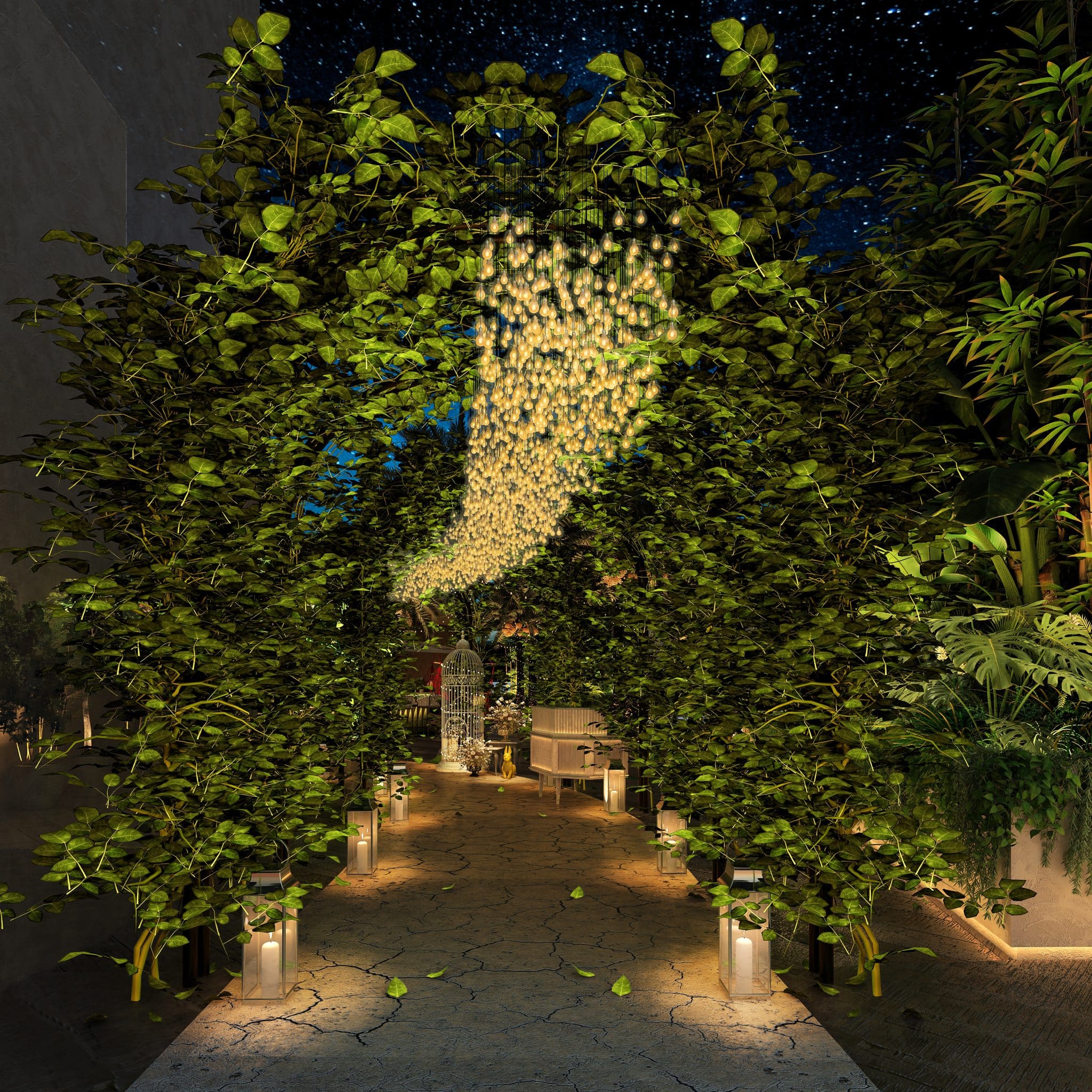 Designed by Bobby Mukherrji Architects, this convention centre unfolds as a lush, immersive journey through layered spatial experiences that merge tropical luxury with theatrical lighting. Guests arrive via a magical green tunnel pathway draped in cascading fairy lights, leading into courtyards and outdoor lounges framed by palm trees wrapped in twinkling strands. Whimsical installations, such as a bicycle silhouette outlined in lights and surrounded by candlelit wooden stumps, set a playful yet elegant tone. Inside, richly detailed lounges and bars pair bold geometric flooring with vibrant botanical murals, woven pendant lamps, and cascading greenery, creating an intimate, high-energy atmosphere. The dining areas are bathed in a warm glow, with plush seating set against sweeping garden views, while the private dining rooms offer a dramatic interplay of suspended bulbs, floral backdrops, and candle-filled birdcages.
