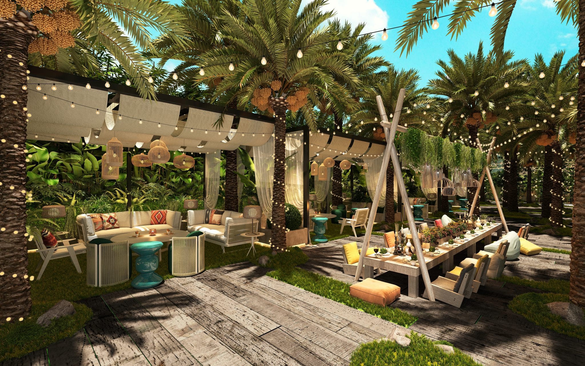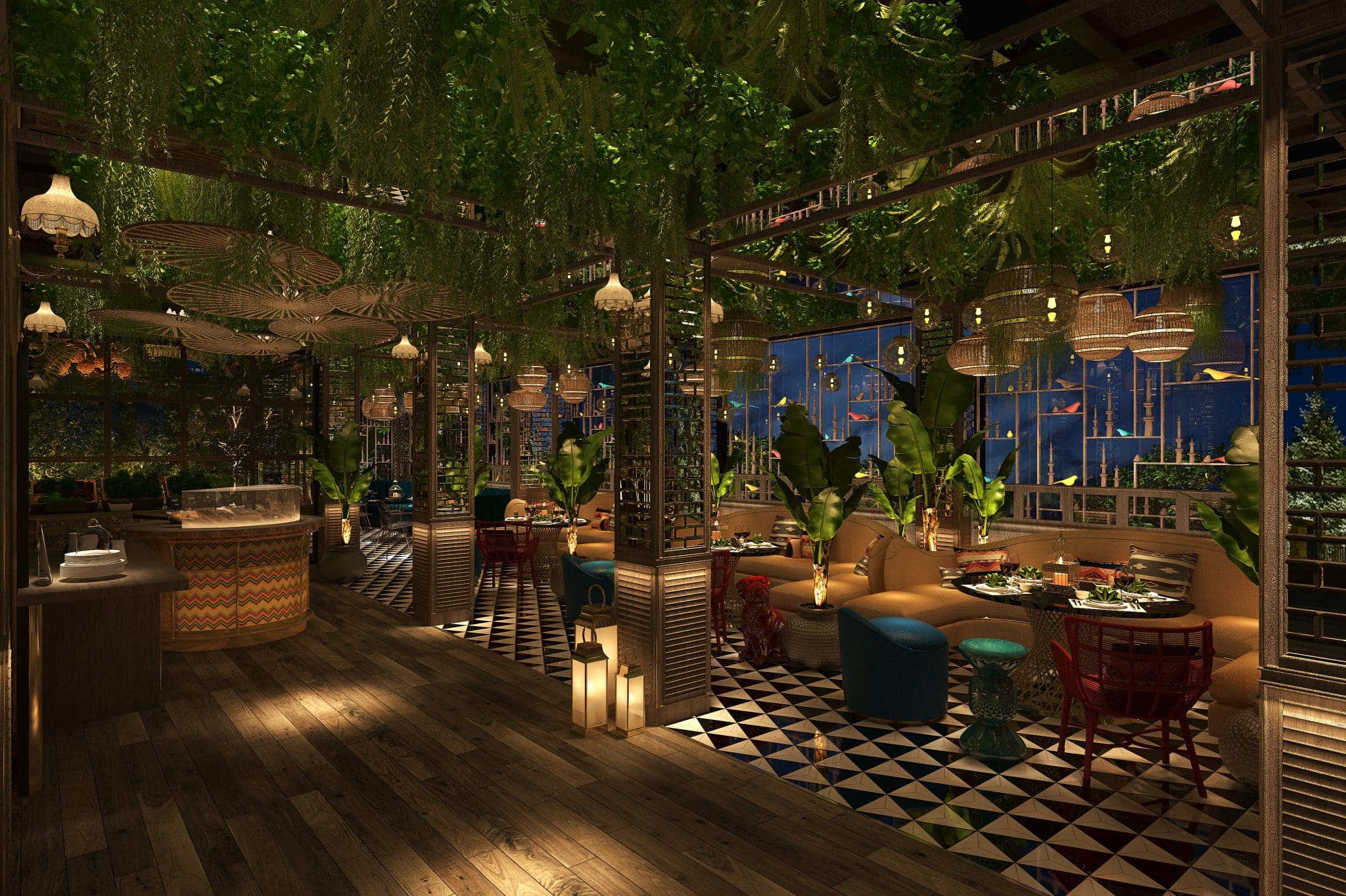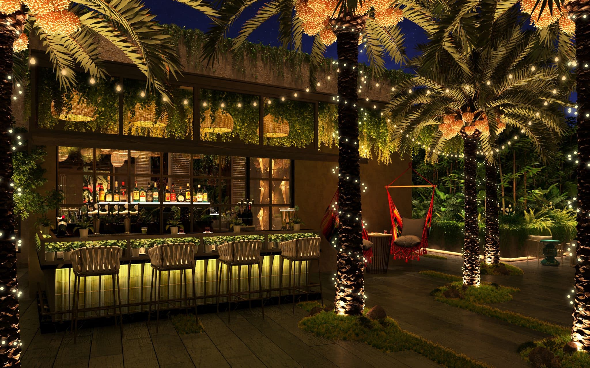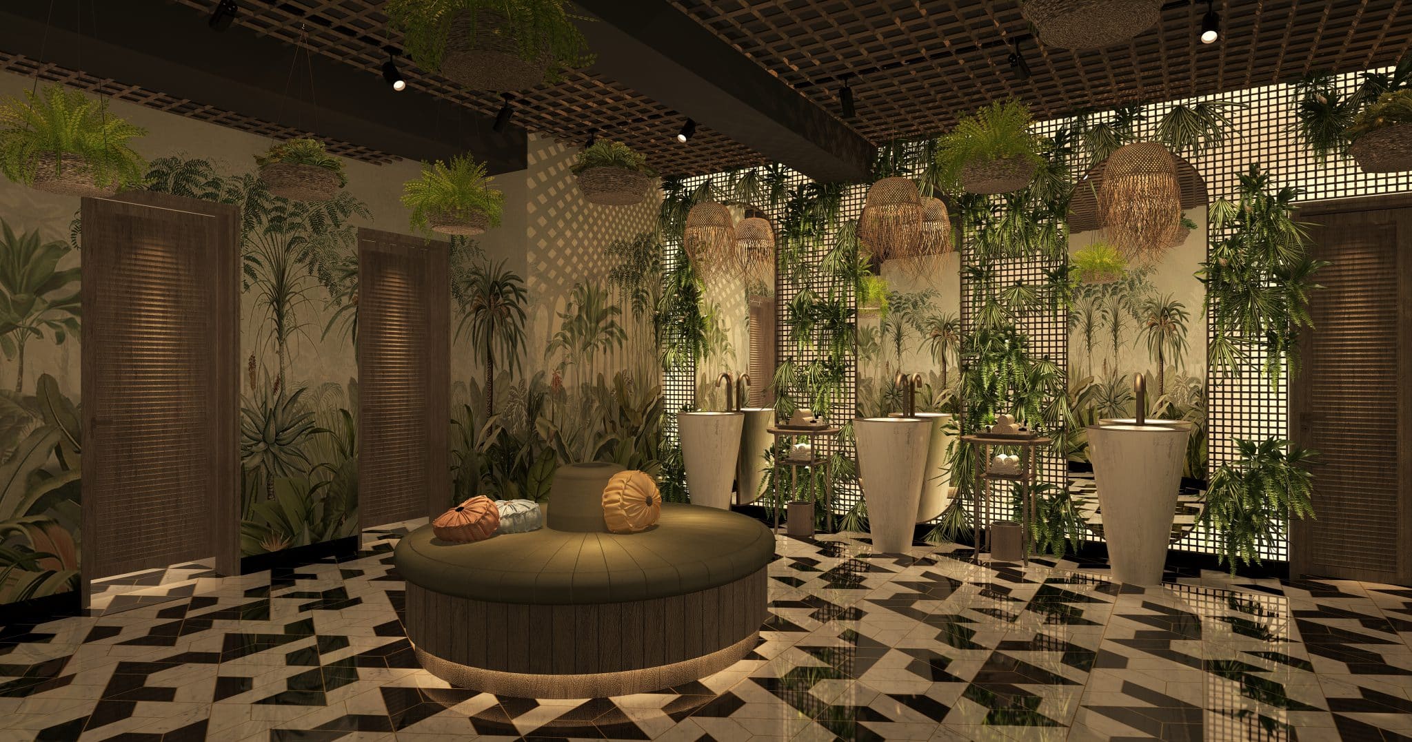 Outdoor bars, hammock lounges, and cabana seating blend seamlessly into the surrounding tropical landscape, their glowing counters and soft drapery evoking resort-like indulgence. Even the service zones are curated as design features, with tiered shelves of plants, ceramics, and artisanal tableware extending the biophilic narrative. Every corner of this convention centre fuses nature, craft, and contemporary glamour—transforming functional spaces into destinations in themselves