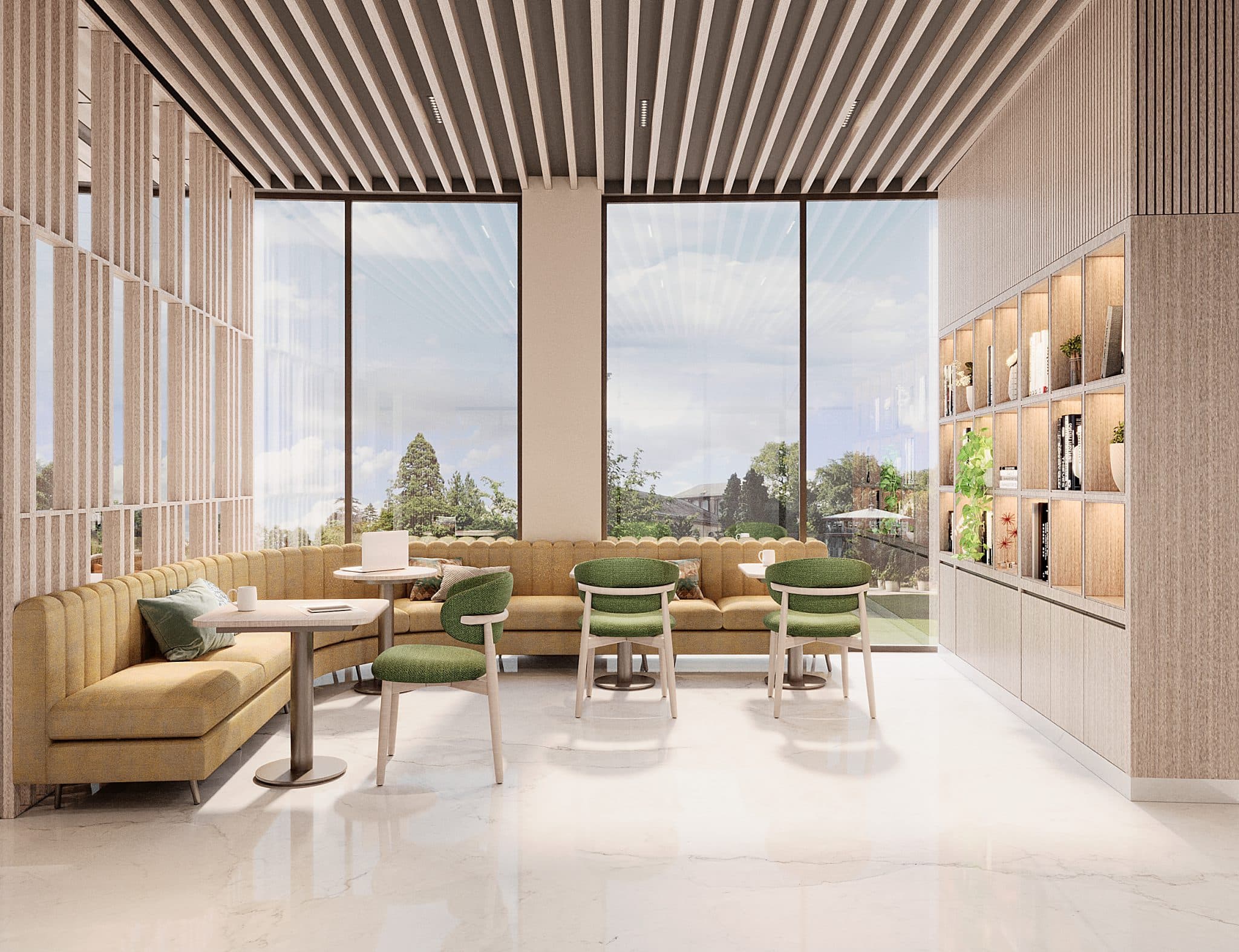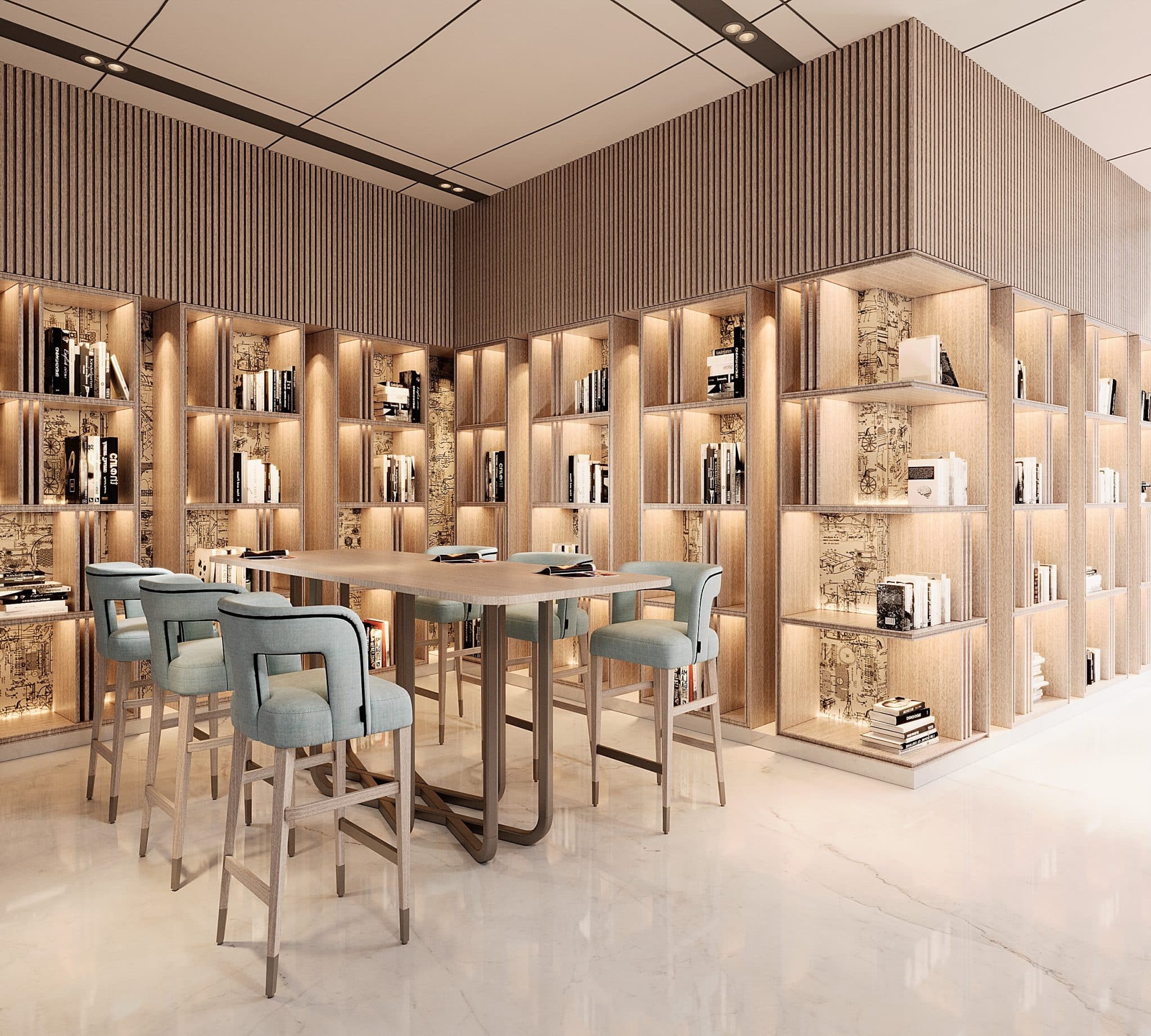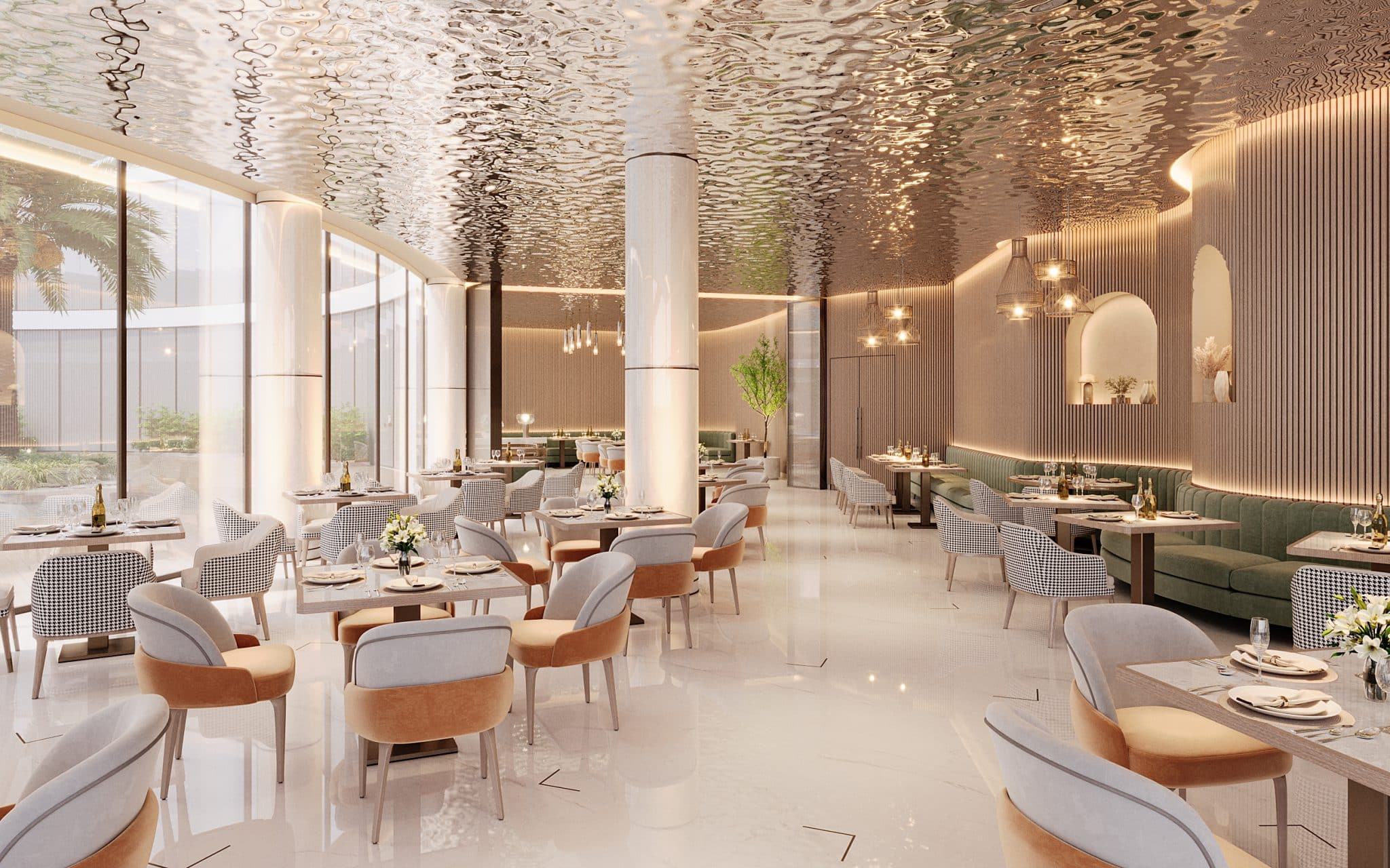 The club’s spatial proportions are gracious, with an orchestration of double-height and single-height volumes that keeps the experience engaging. Within the plush materiality, two traits play a starring role: transparency and reflectiveness. The former becomes crucial to maintaining the connect with the focal water garden, while slick, reflective or rippled expanses evoke a still or wind-kissed water surface respectively. Forms evoke a mix of fluidity and straight lines, establishing a narrative that, while modern, constantly references the club’s highlight.