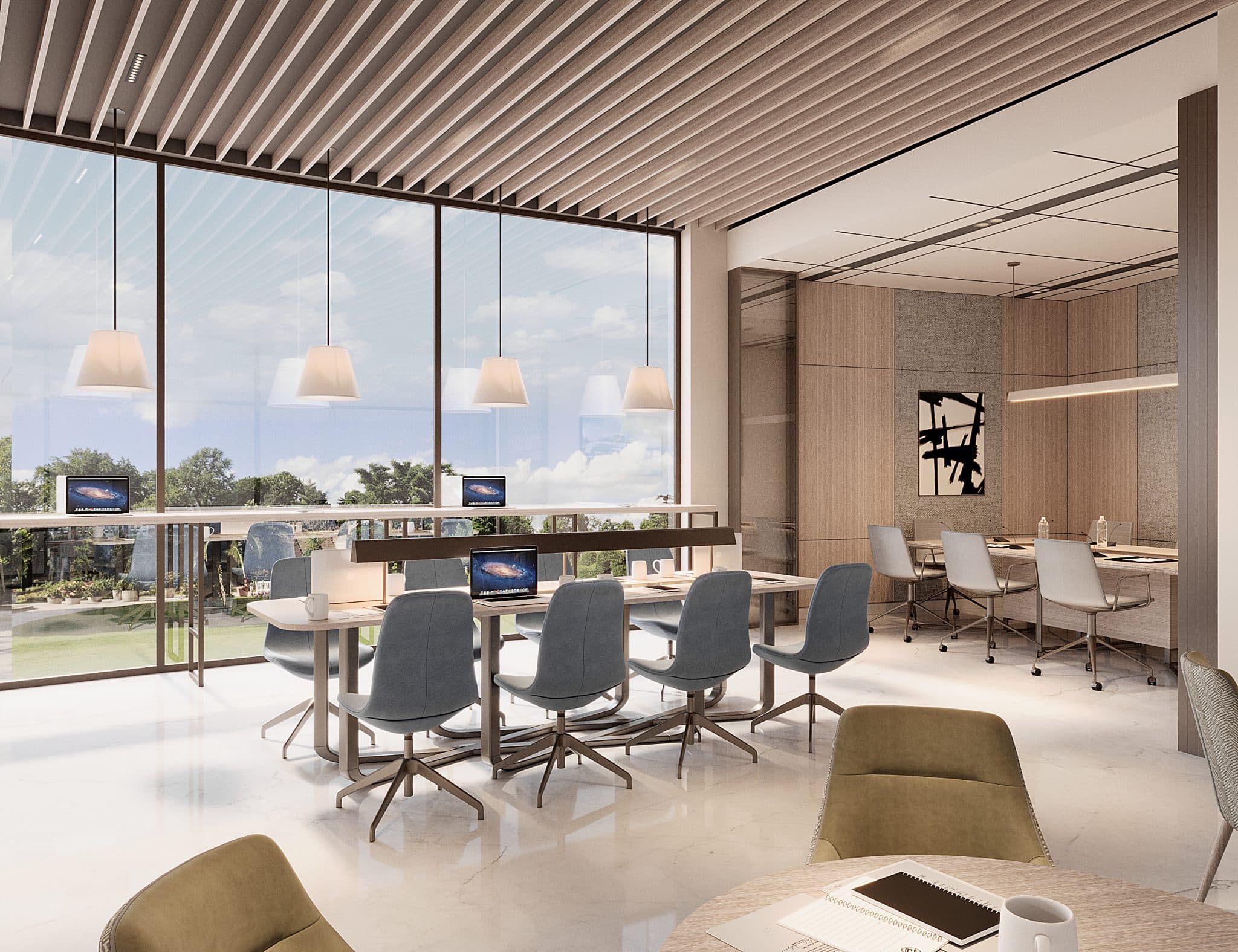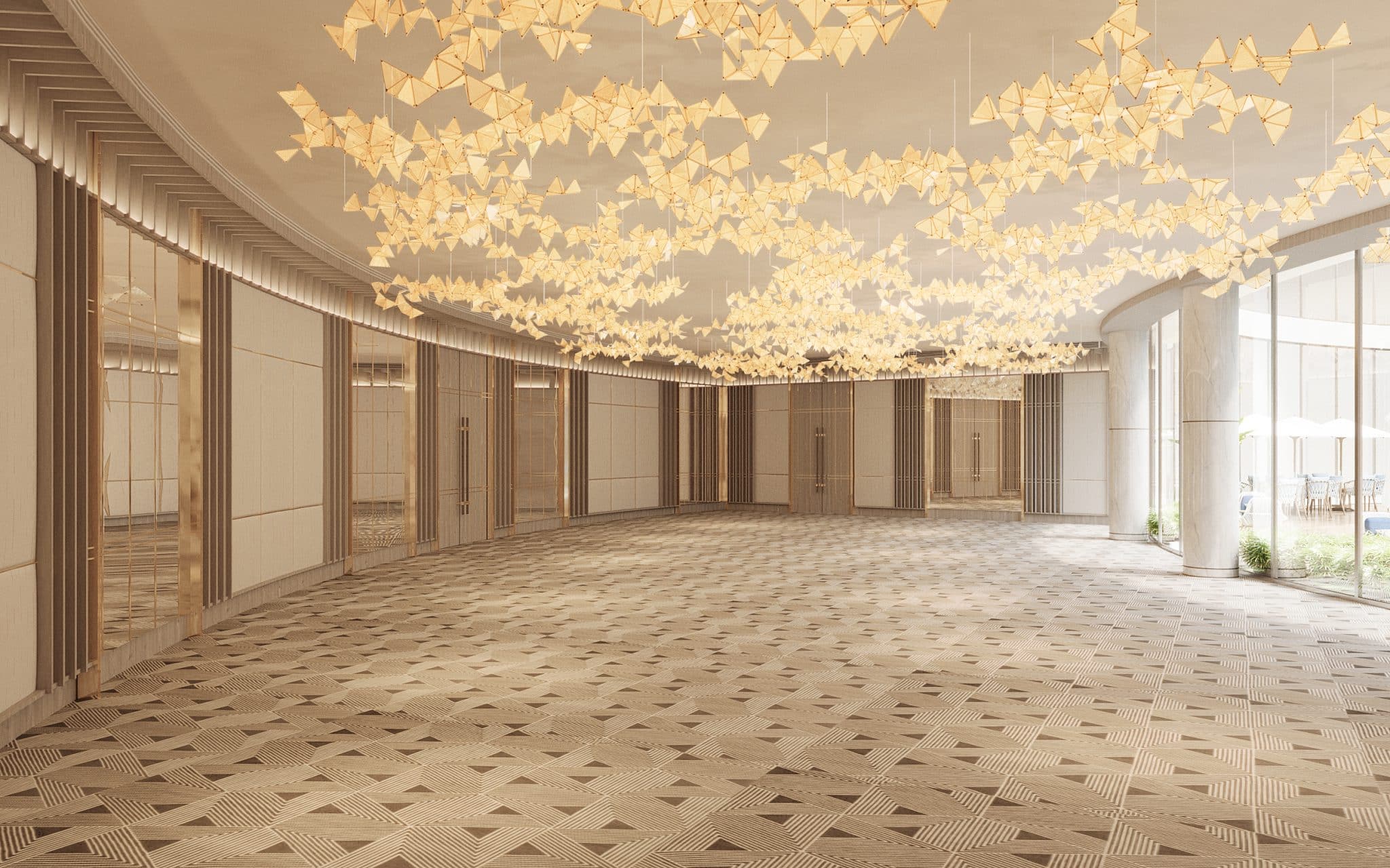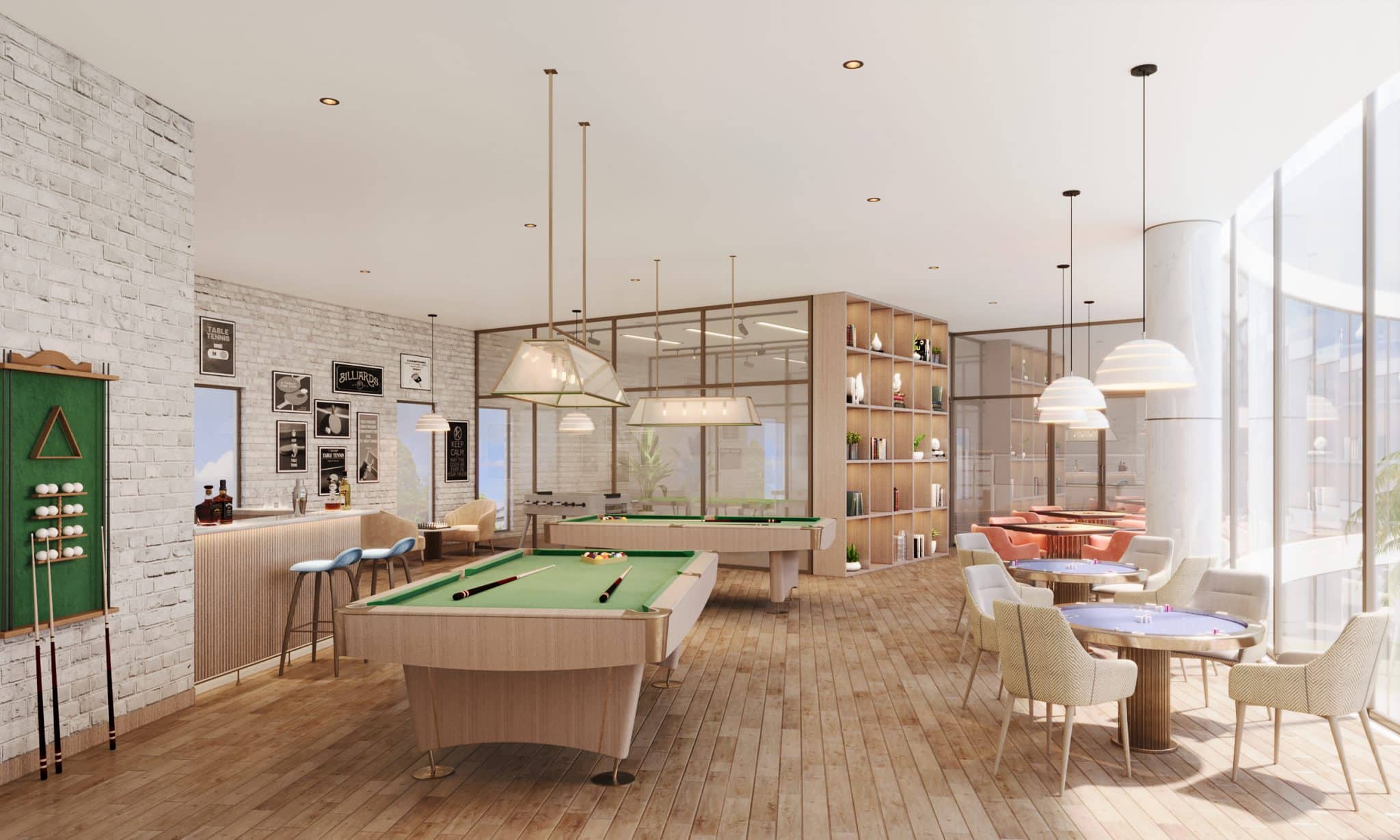 The club’s spatial proportions are gracious, with an orchestration of double-height and single-height volumes that keeps the experience engaging. Within the plush materiality, two traits play a starring role: transparency and reflectiveness. The former becomes crucial to maintaining the connect with the focal water garden, while slick, reflective or rippled expanses evoke a still or wind-kissed water surface respectively. Forms evoke a mix of fluidity and straight lines, establishing a narrative that, while modern, constantly references the club’s highlight.