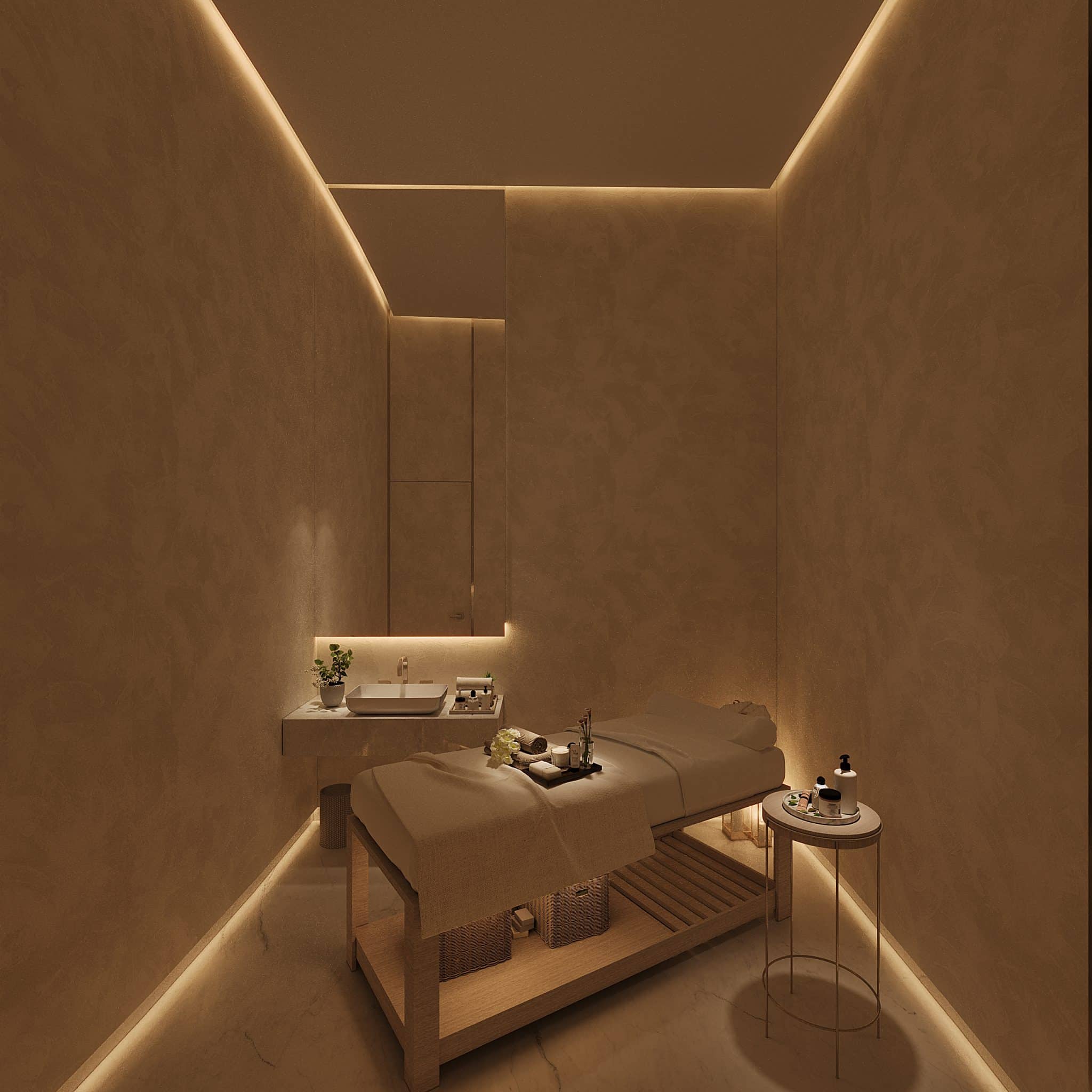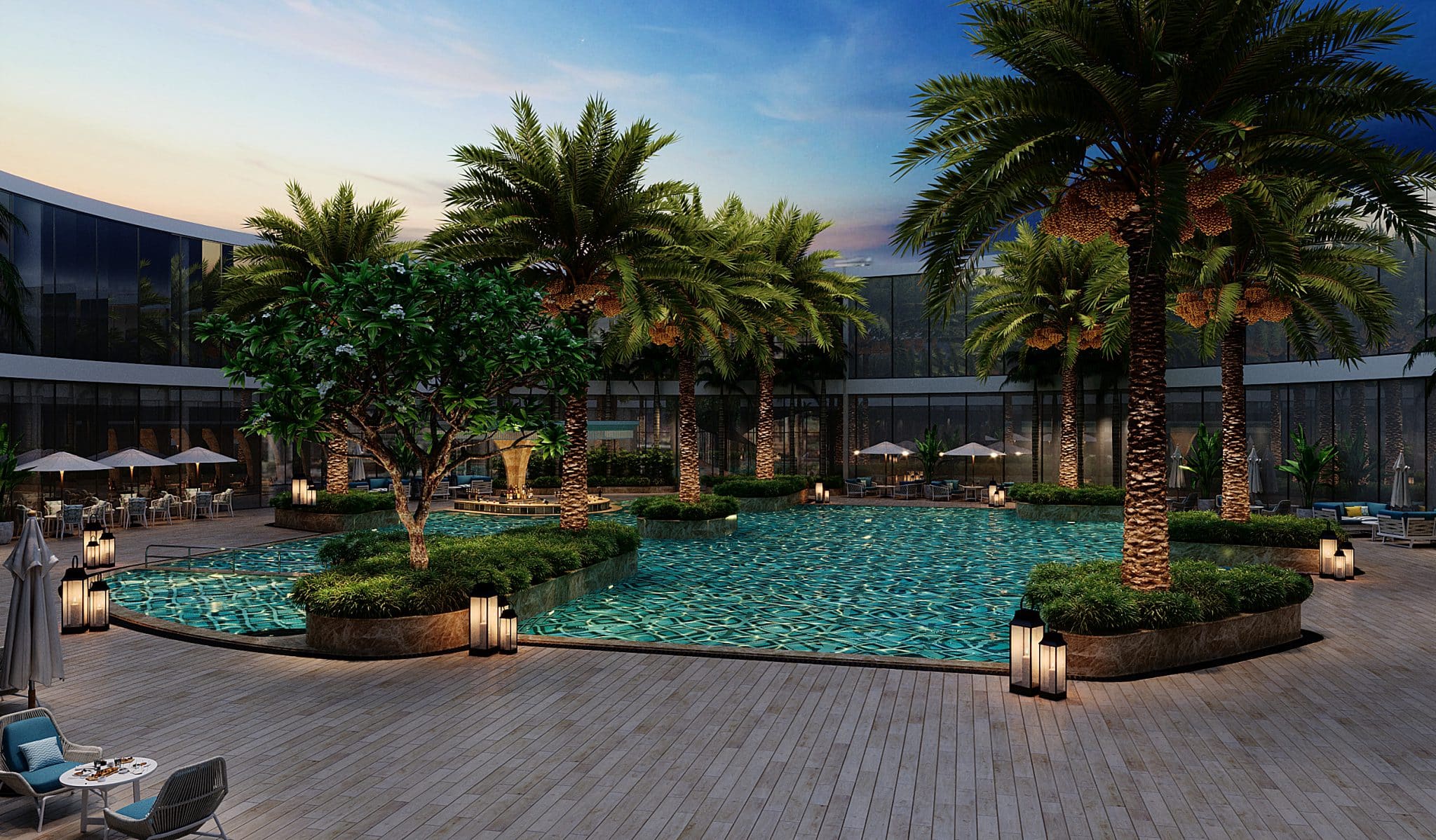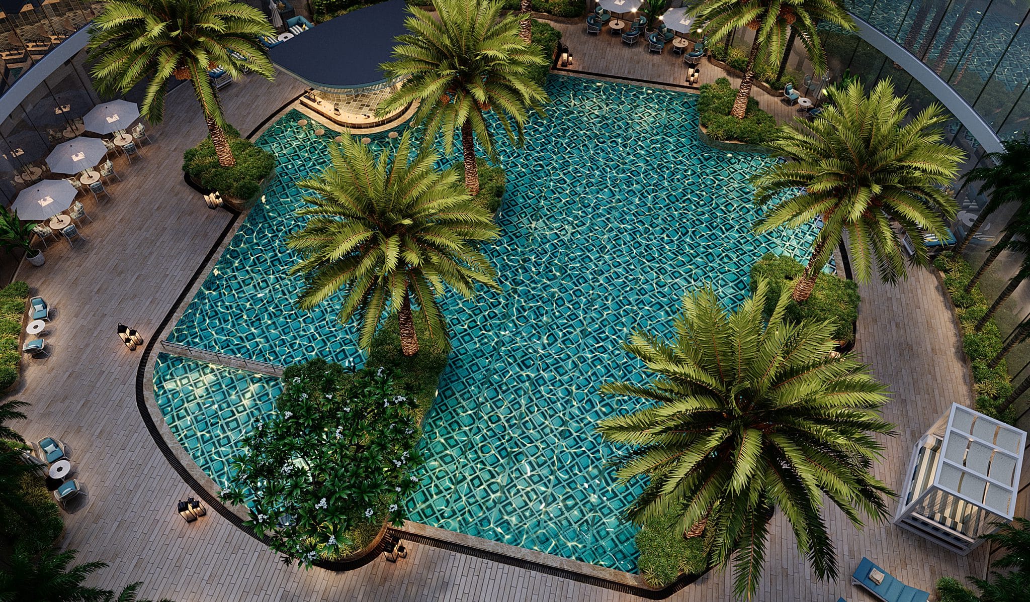 The programme begins, on the ground floor, with an expansive reception with a striking helical staircase ascending to the upper floors. This is followed by a 98-cover restaurant with gently undulating walls; a spacious banquet hall; a business center and co-working space connected to a library; an atmospheric karaoke lounge and a spa. The first floor houses a games room, a gym, a mini theatre, while the second floor is devoted to an effervescent children’s area. The pool, the focal point of the club, is landscaped with palms growing on peninsula-like projections into the water and an island, creating an idyllic setting. Loungers and seating islands occupy the sprawling deck. All other programmatic constituents either border this beautiful aqueous heart or overlook it.