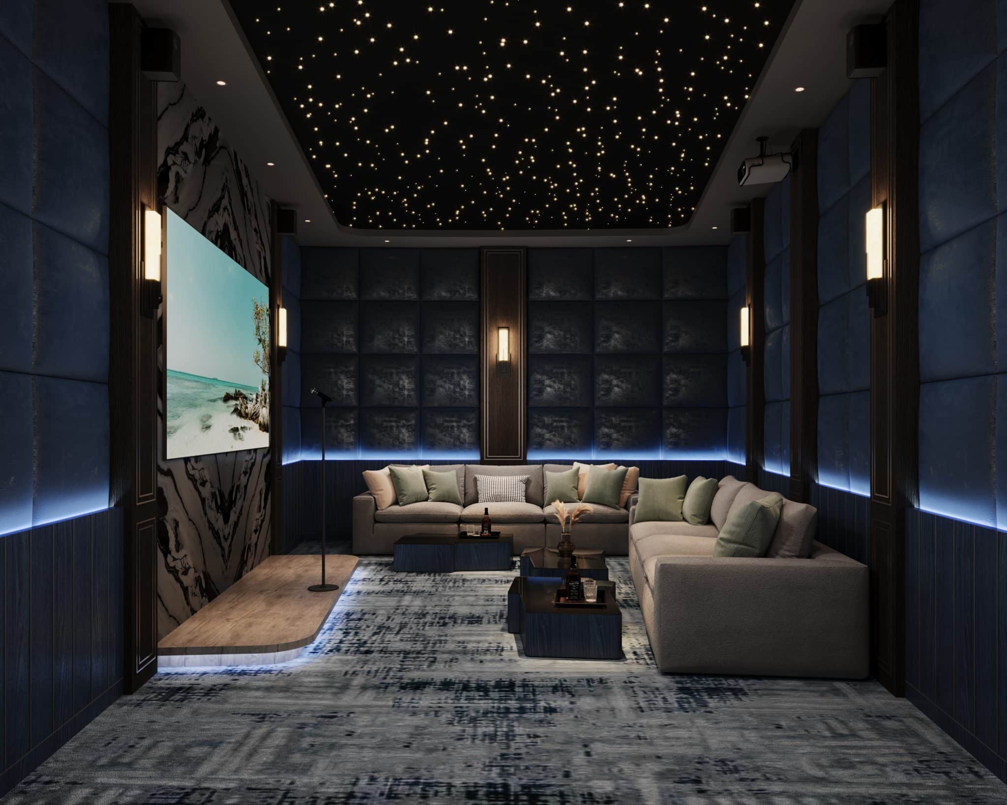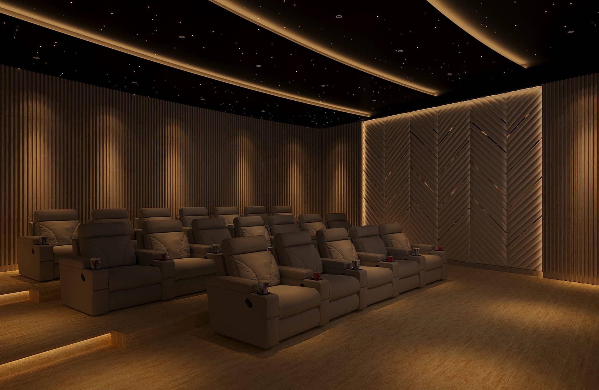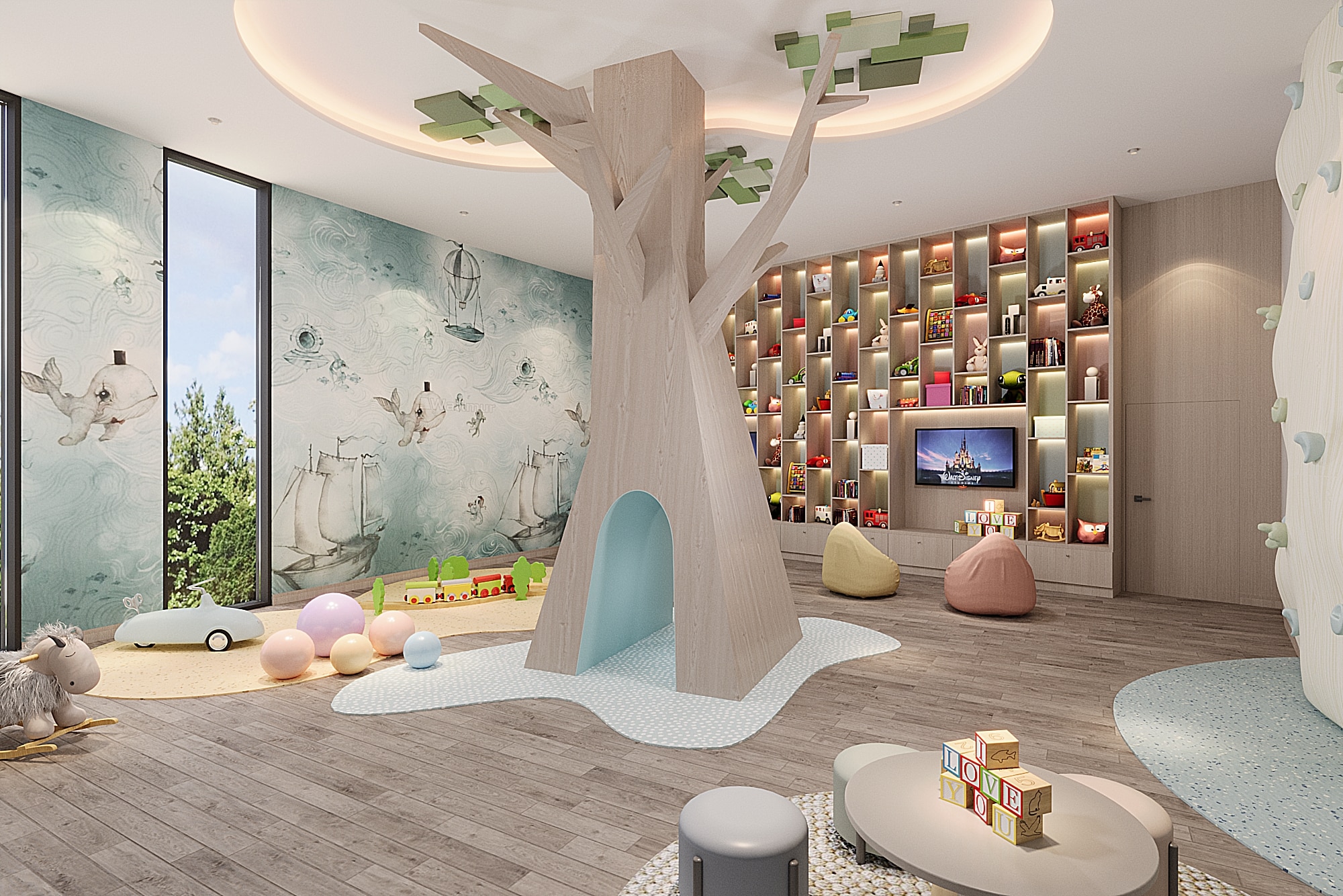 The programme begins, on the ground floor, with an expansive reception with a striking helical staircase ascending to the upper floors. This is followed by a 98-cover restaurant with gently undulating walls; a spacious banquet hall; a business center and co-working space connected to a library; an atmospheric karaoke lounge and a spa. The first floor houses a games room, a gym, a mini theatre, while the second floor is devoted to an effervescent children’s area. The pool, the focal point of the club, is landscaped with palms growing on peninsula-like projections into the water and an island, creating an idyllic setting. Loungers and seating islands occupy the sprawling deck. All other programmatic constituents either border this beautiful aqueous heart or overlook it.