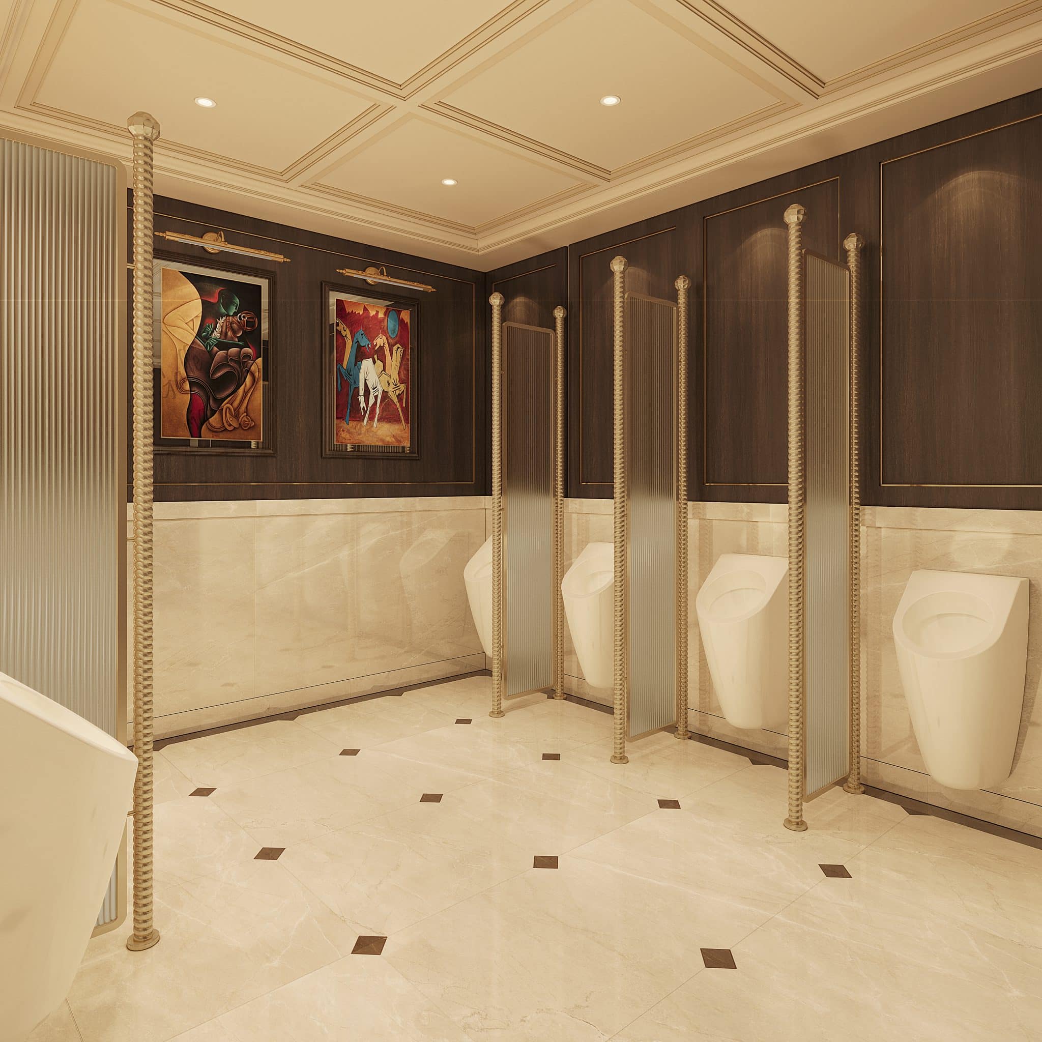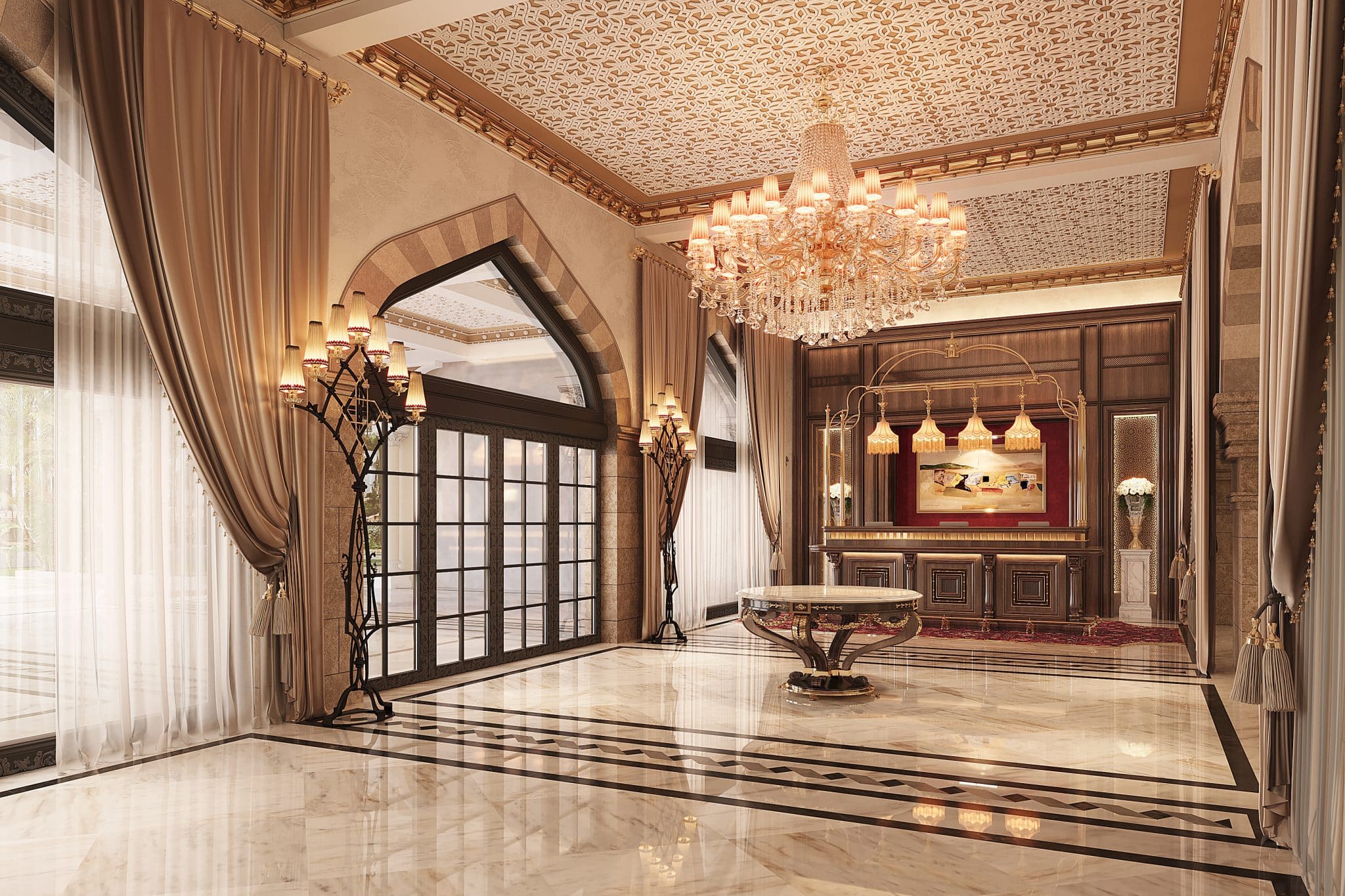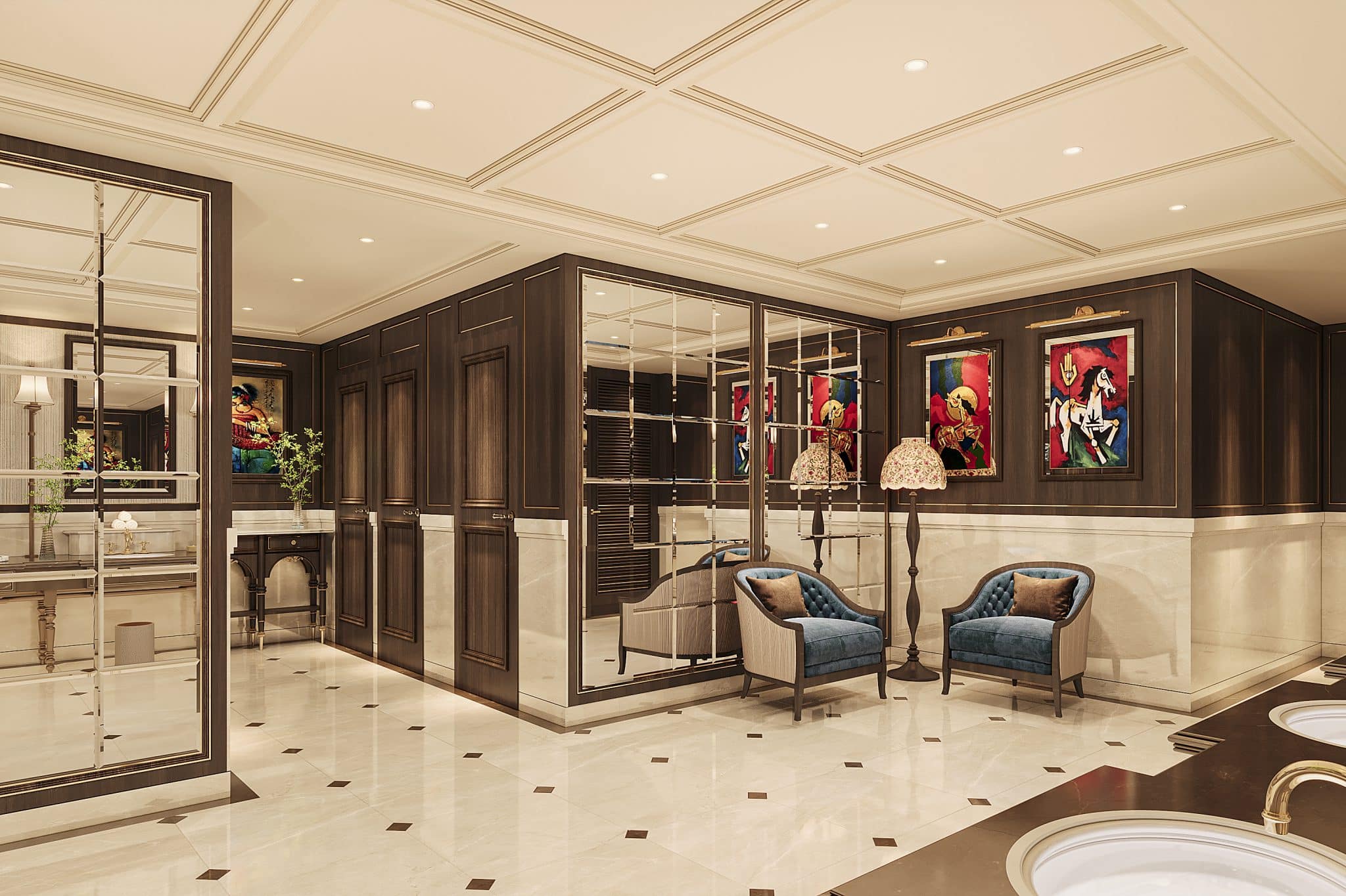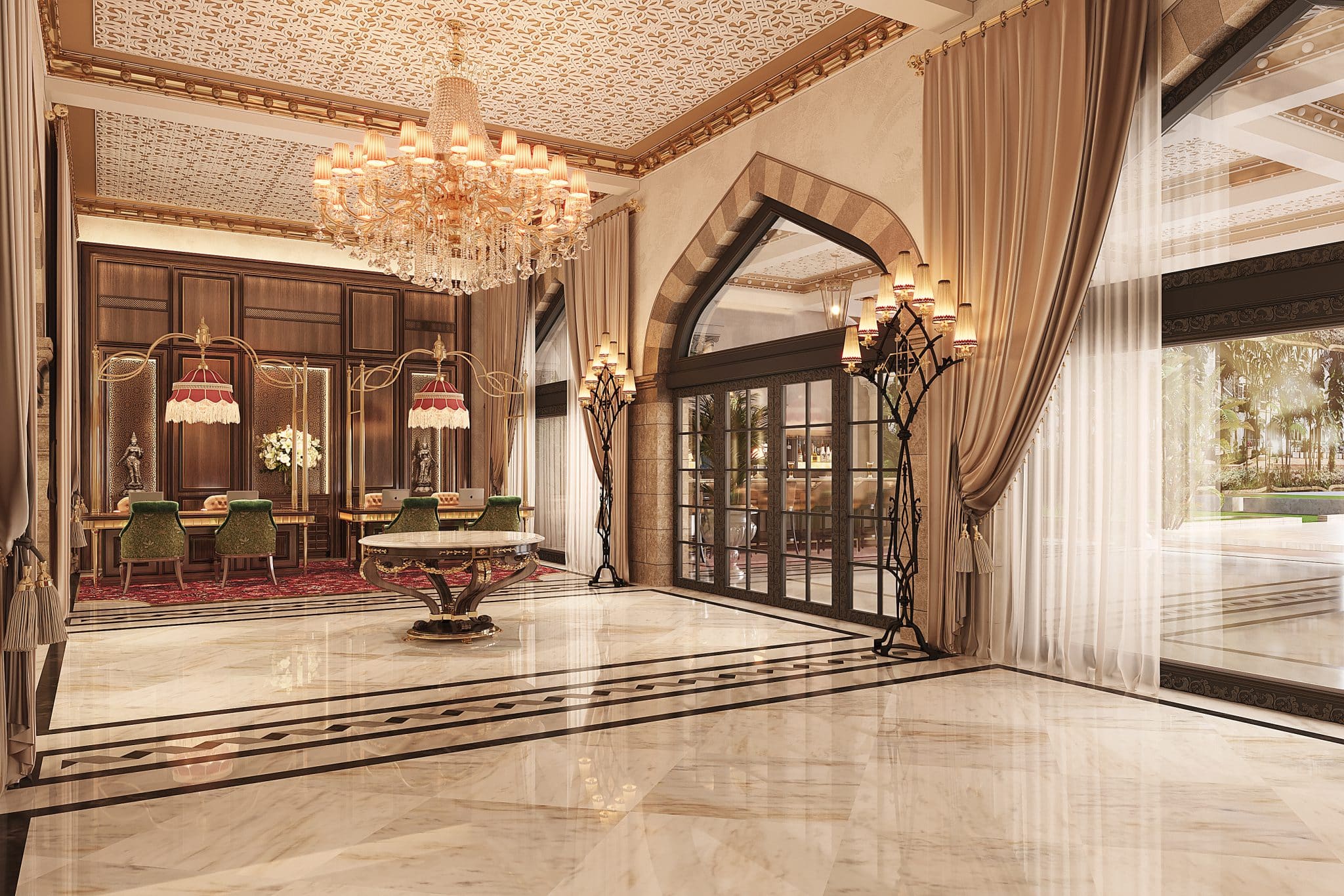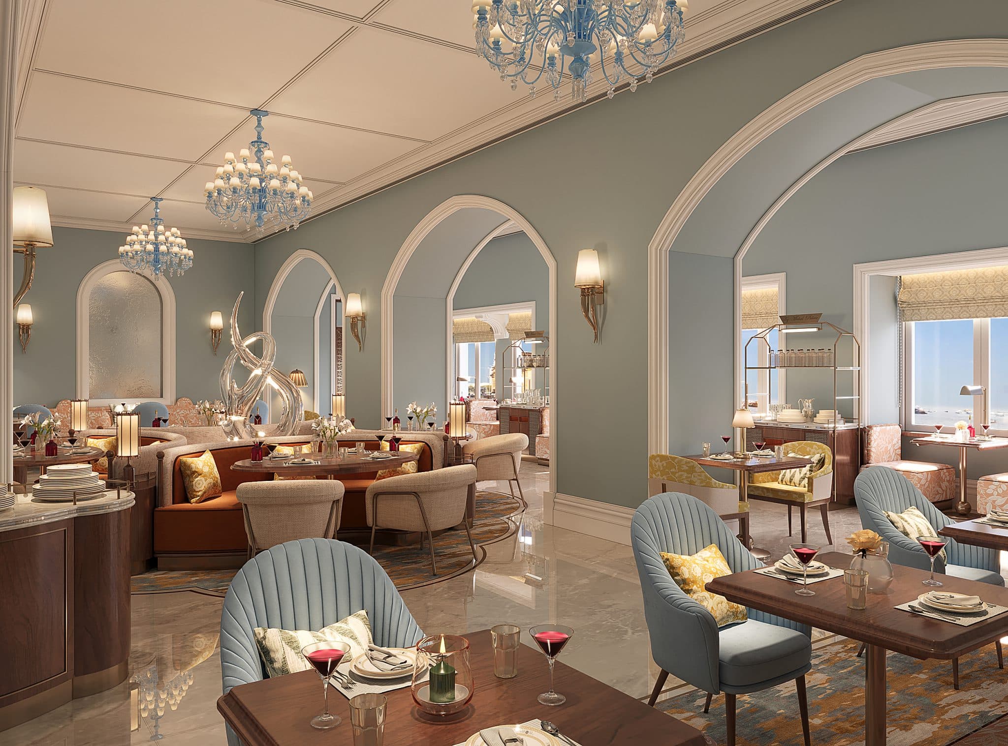 Serenity and coastal opulence are achieved through a sophisticated palette of deep blues, warm beiges, and gold accents. Depth and texture are provided by bespoke detailing, antique mirrors, stained glass, patterned quartzite, and mosaic flooring, all showcasing artisanal craftsmanship. Orchestrated lighting changes throughout the day, accentuating architectural nuances and framing uninterrupted views of the Arabian Sea.