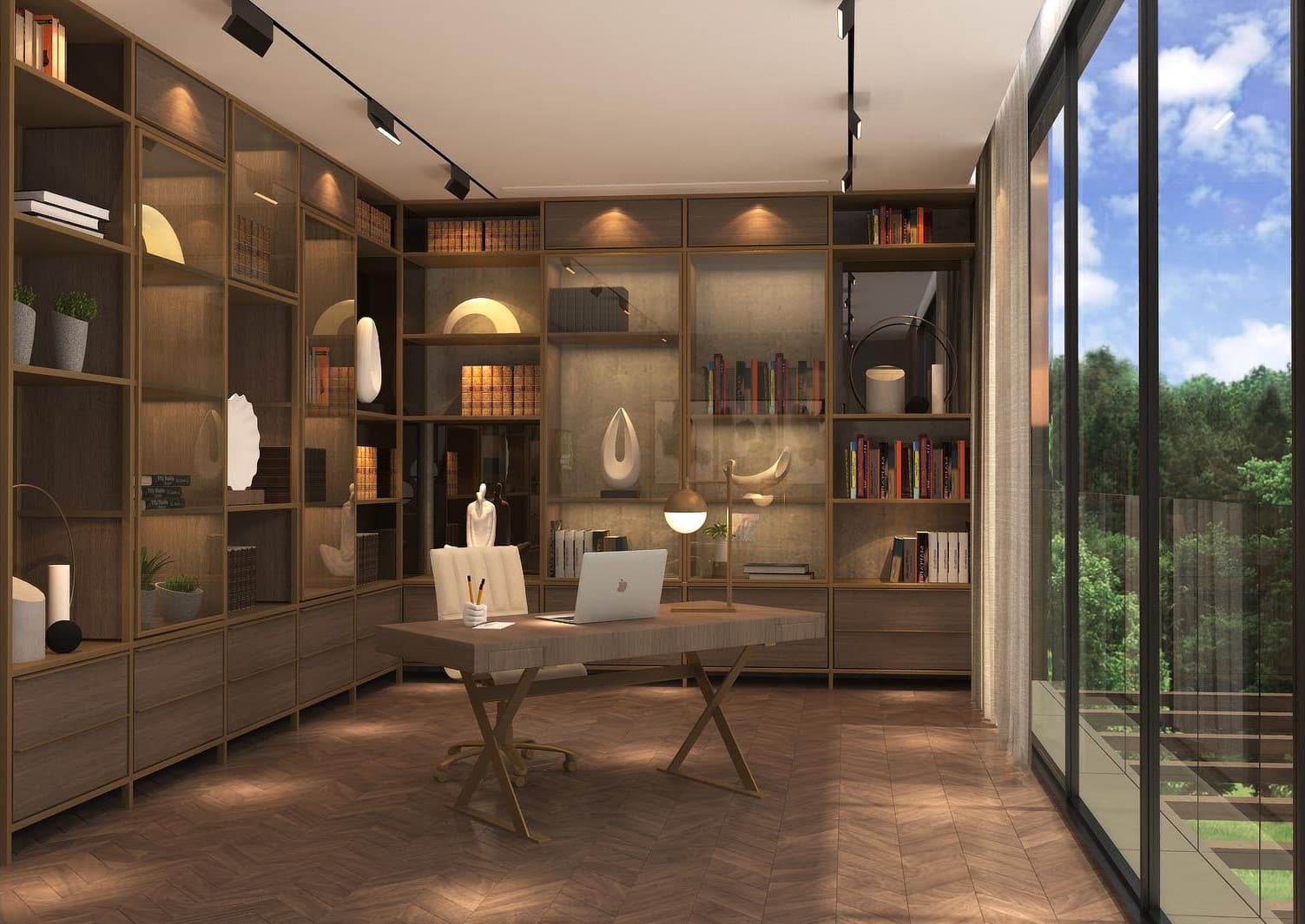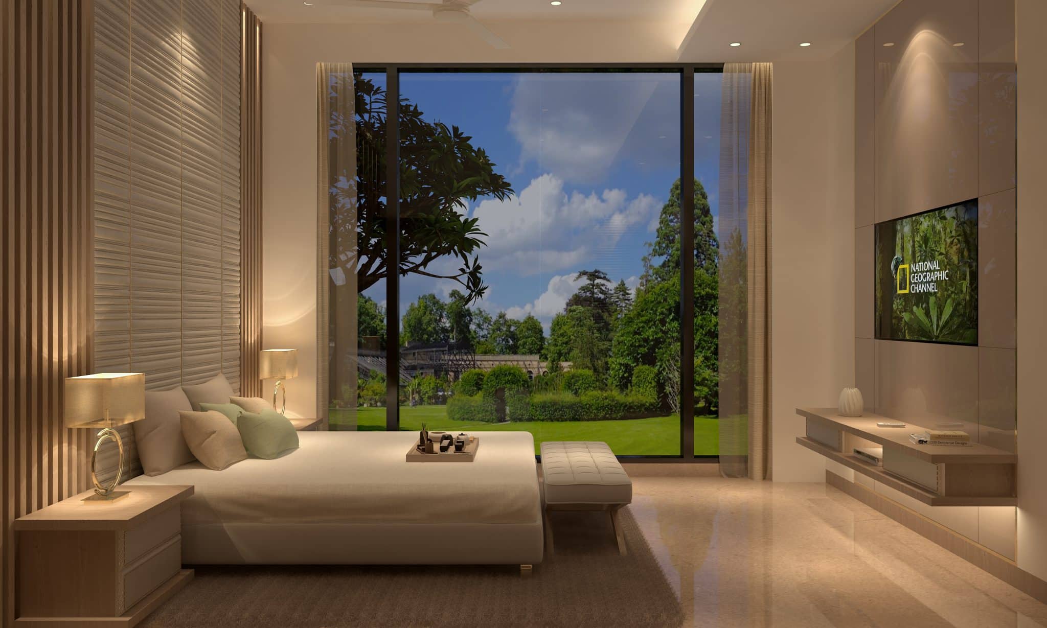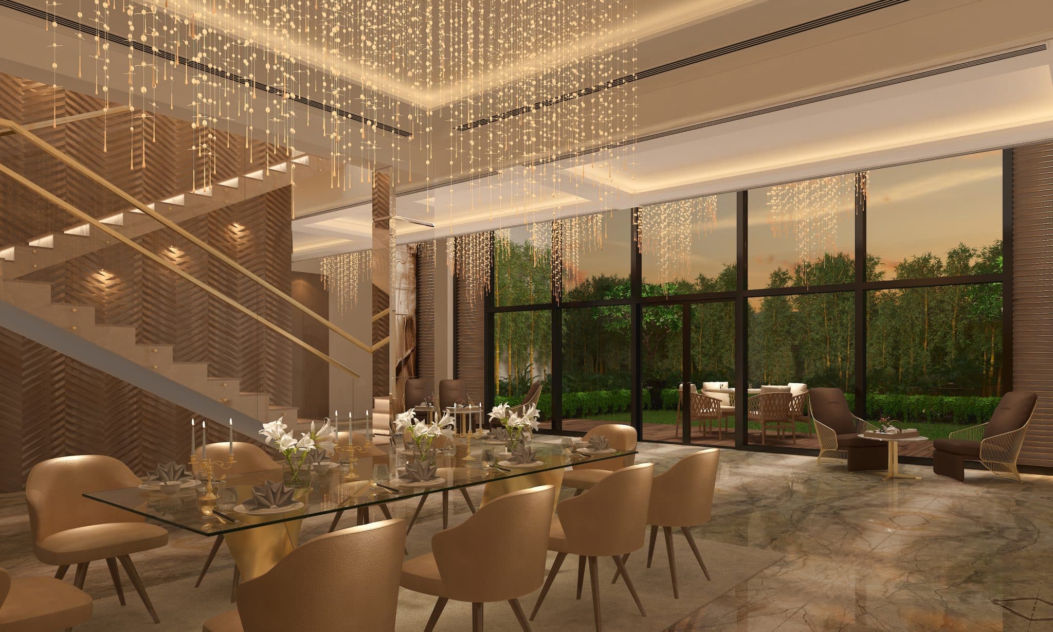 The intrinsic beauty of the materials is further amplified with surface finishing techniques that lend textural drama to the spatial compositions. The programme includes two living rooms: one reserved for formal entertaining and the other that welcomes family and friends for close-knit congregations. The unexpected and surprising material application strategy is seen in the ceilings: one is lined with wood, and the other with woven leather. While the entire villa is cocooned in nature, the rooms on the ground floor enjoy a special connection to the outdoors through decks that segue into green spaces. A double-height, light-filled volume on this level evokes the traditional courtyard, and is dramatised through beautiful chandeliers. Of the four bedrooms, two are designed as master suites with commodious sleeping areas and equally spacious bathrooms.