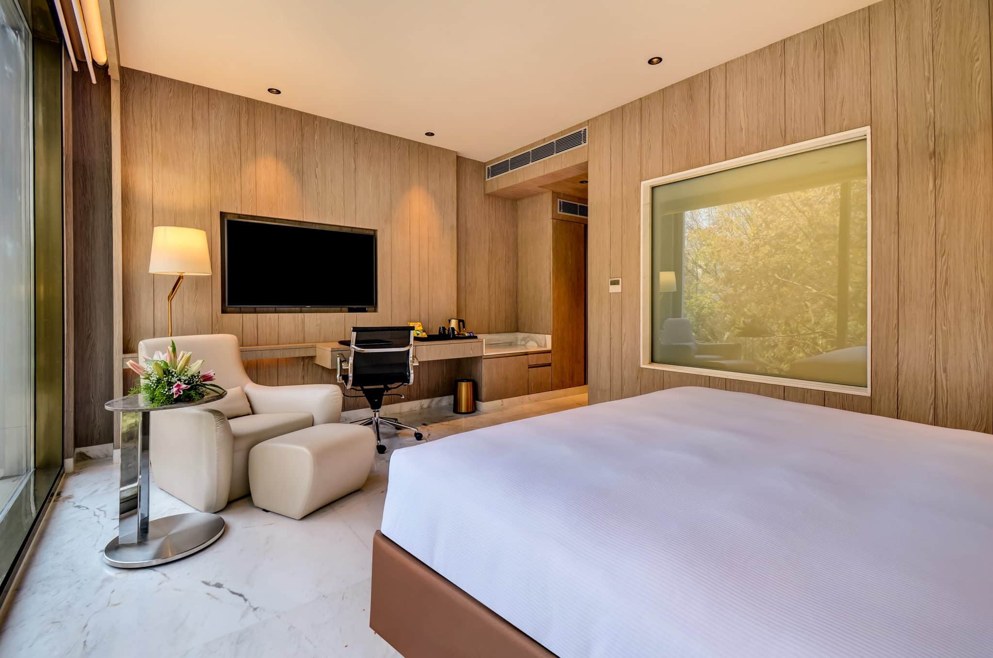 The rooms and suites weave technology with warmth. They are fully automated and bring together several new-age features, notably the smart glass partition between the sleeping and bathing areas that turn opaque at the press of a button and the roller blinds at the windows that can be similarly operated. This was a conscious decision taken to gain traction with the primary demographic. At the same time, the extensive veneer paneling and warm lighting give these guest spaces a wonderfully cocooned atmosphere. The furniture is comfortable and soft-edged, peppered with small retro touches in places. In many rooms, the spatial experience is heightened by the view of the beautiful old trees that embrace this property all around.